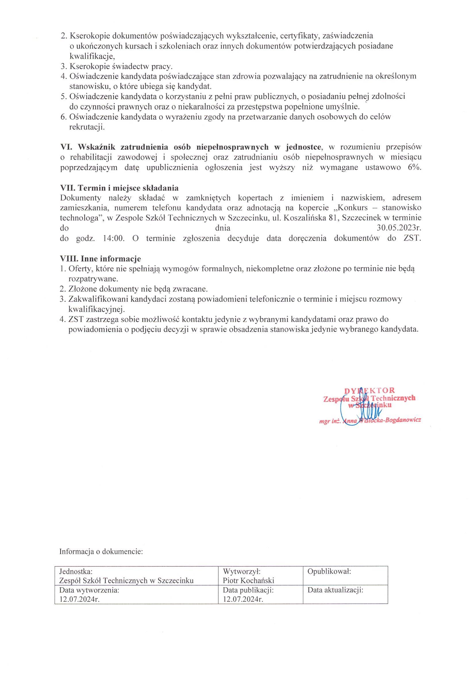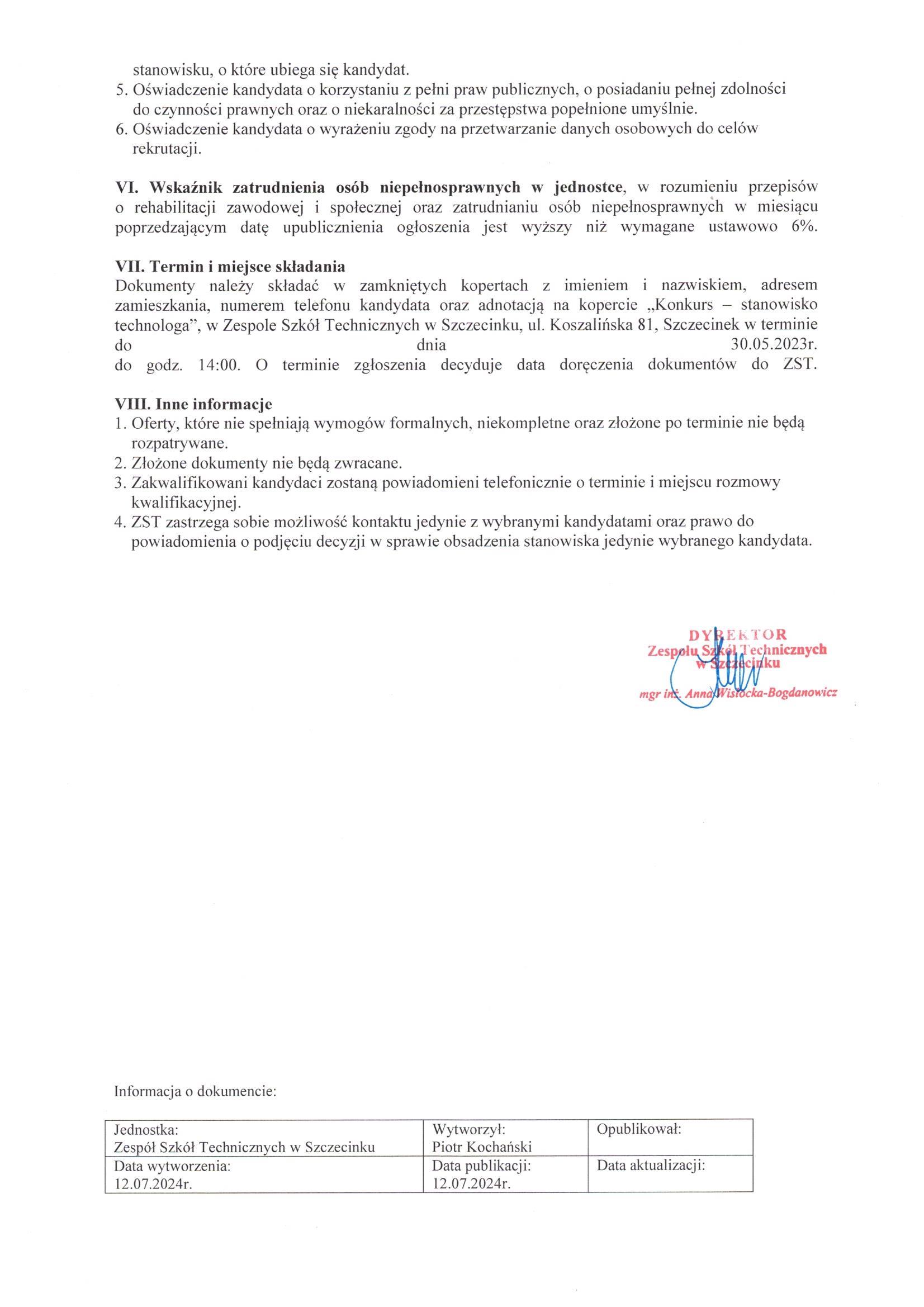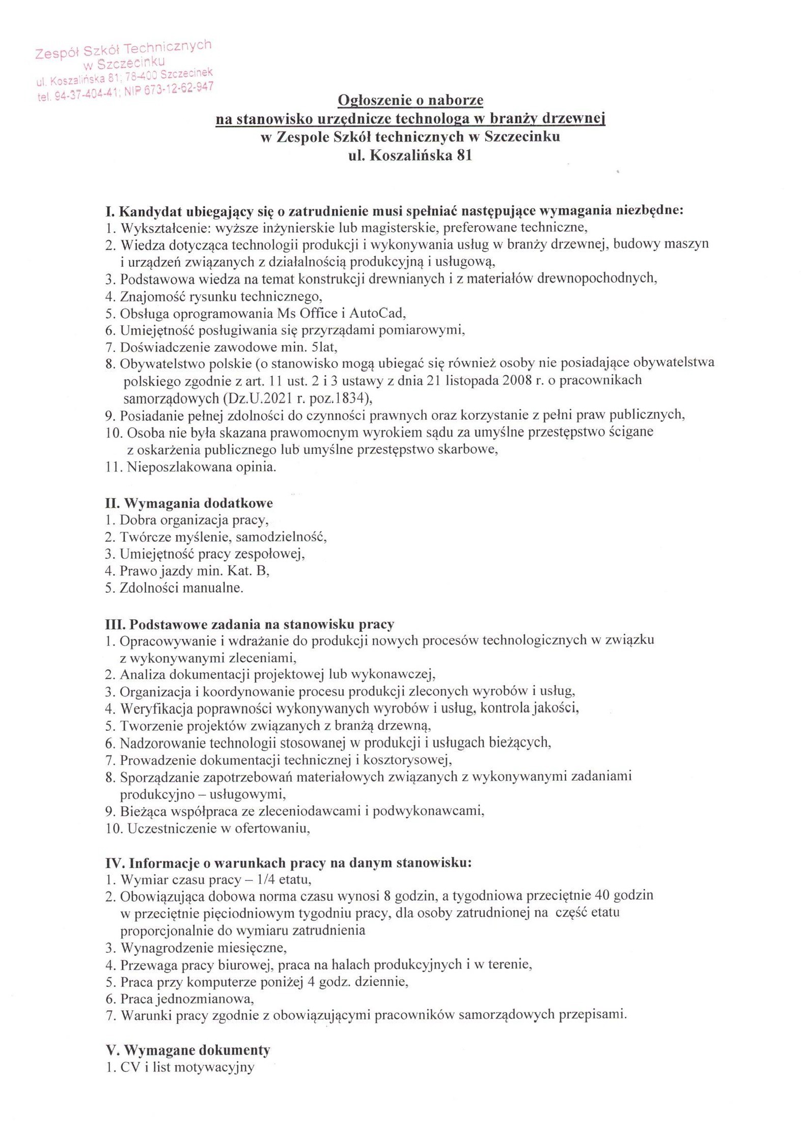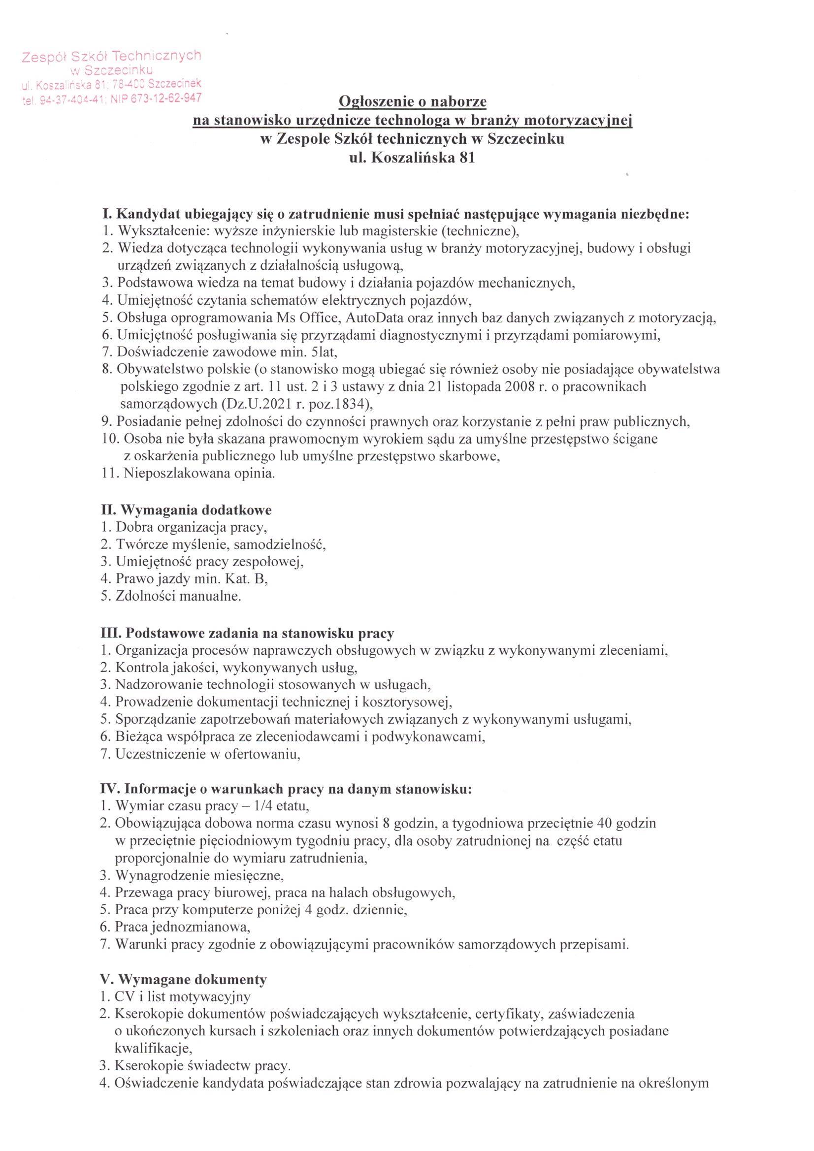 Szczegóły oferty i Ogłoszenia Dyrektora ZST w załączniku poniżej: