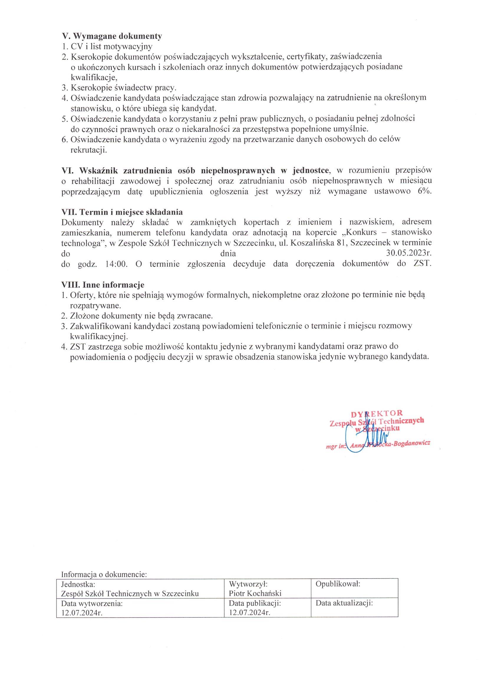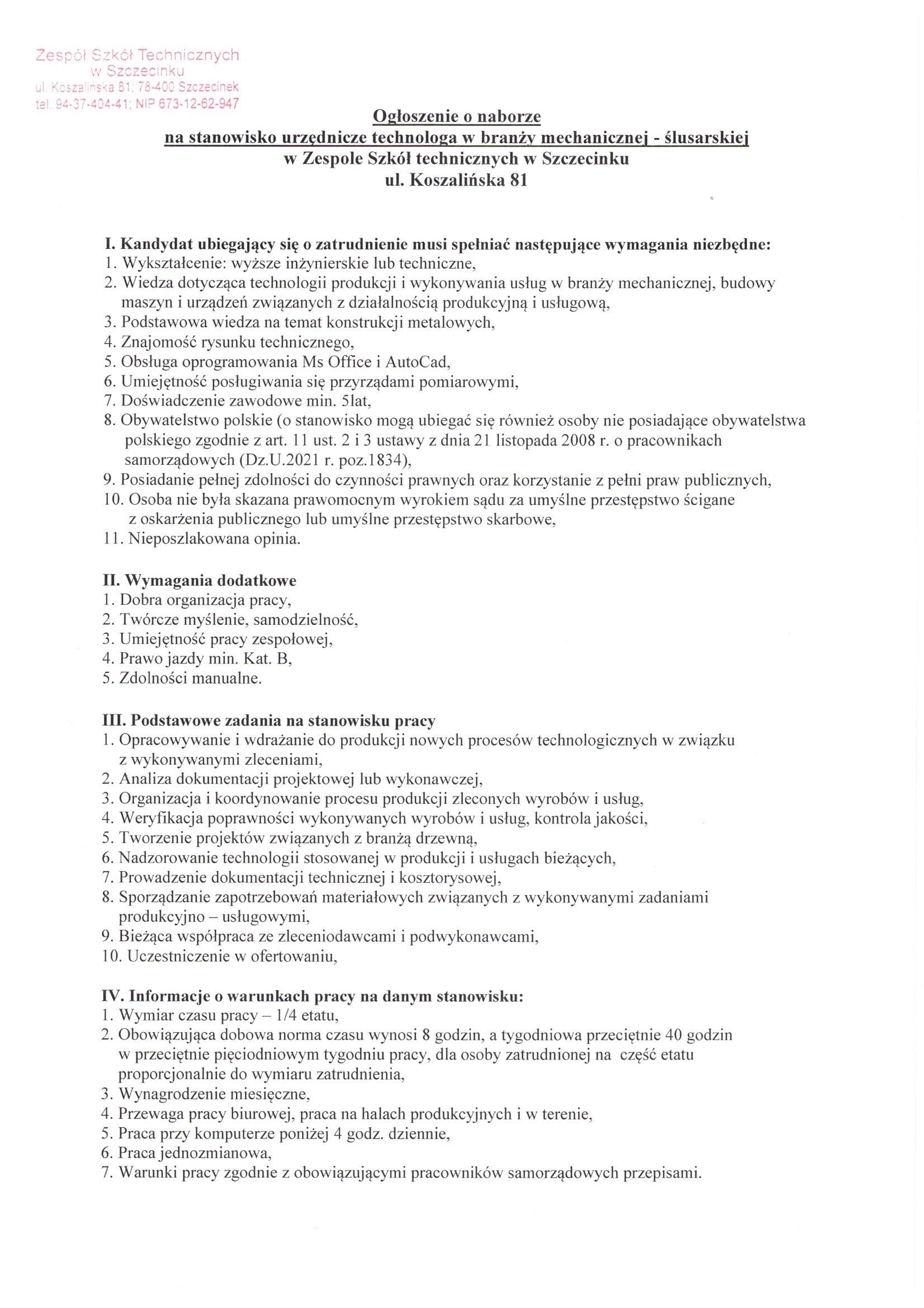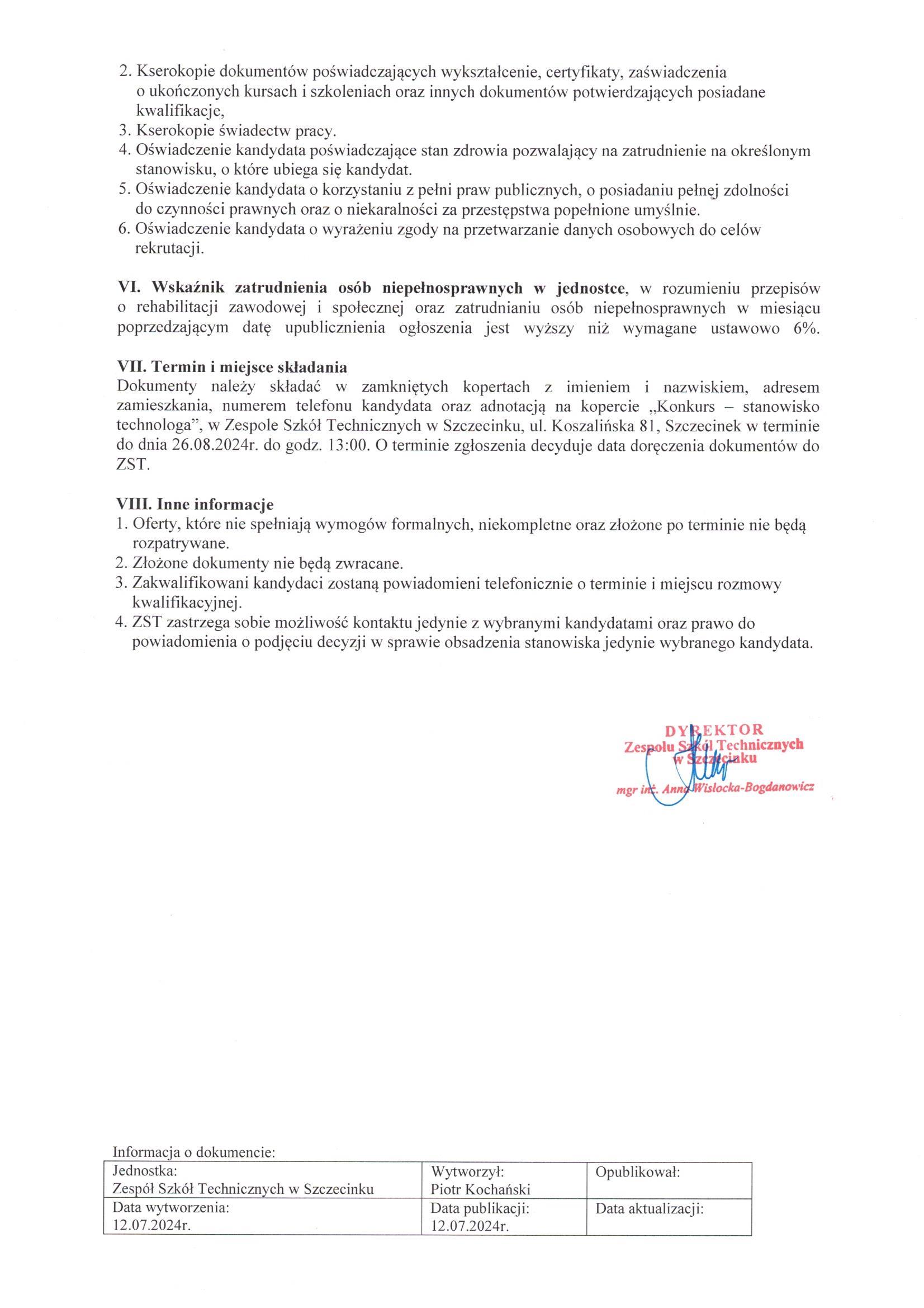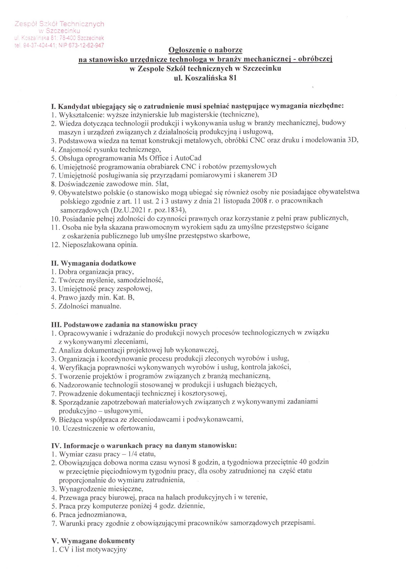 Szczegóły oferty i Ogłoszenia Dyrektora ZST w załączniku poniżej: